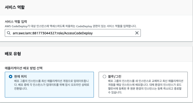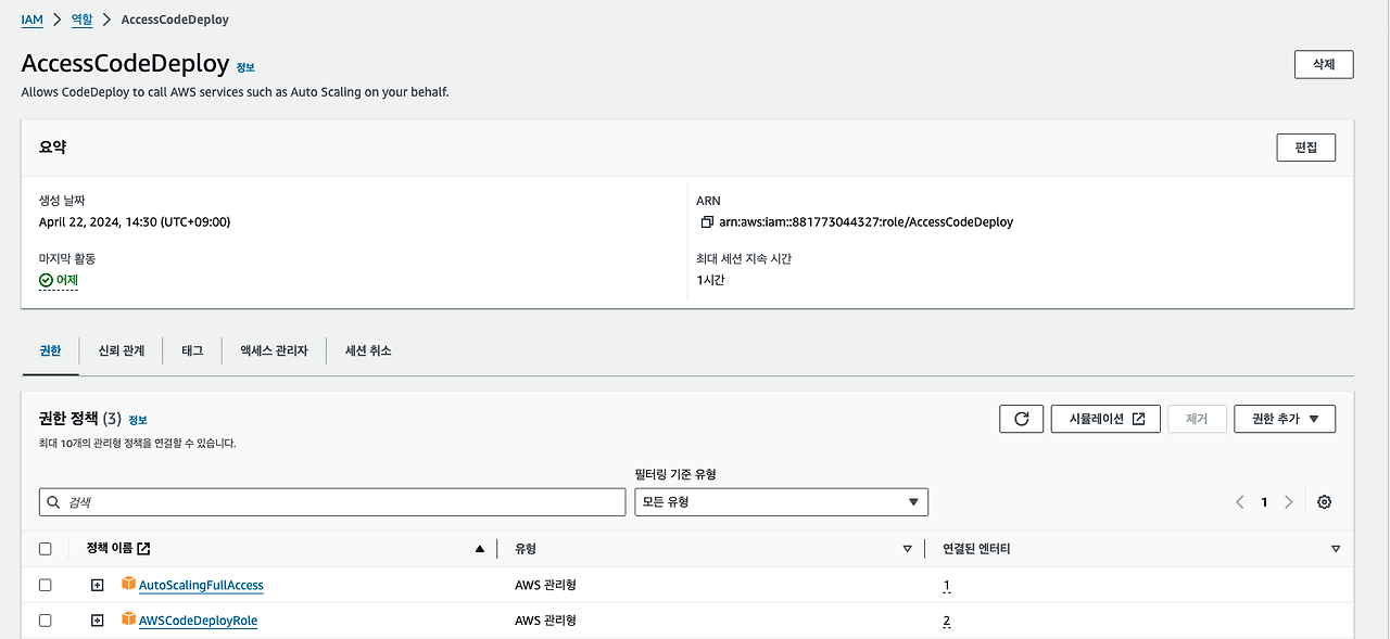 애플리케이션 생성 후 배포 그룹을 생성해줘야 하는데, 사전 작업으로 IAM에 CodeDeploy 관련 정책이 부여된 역할을 생성해야한다.