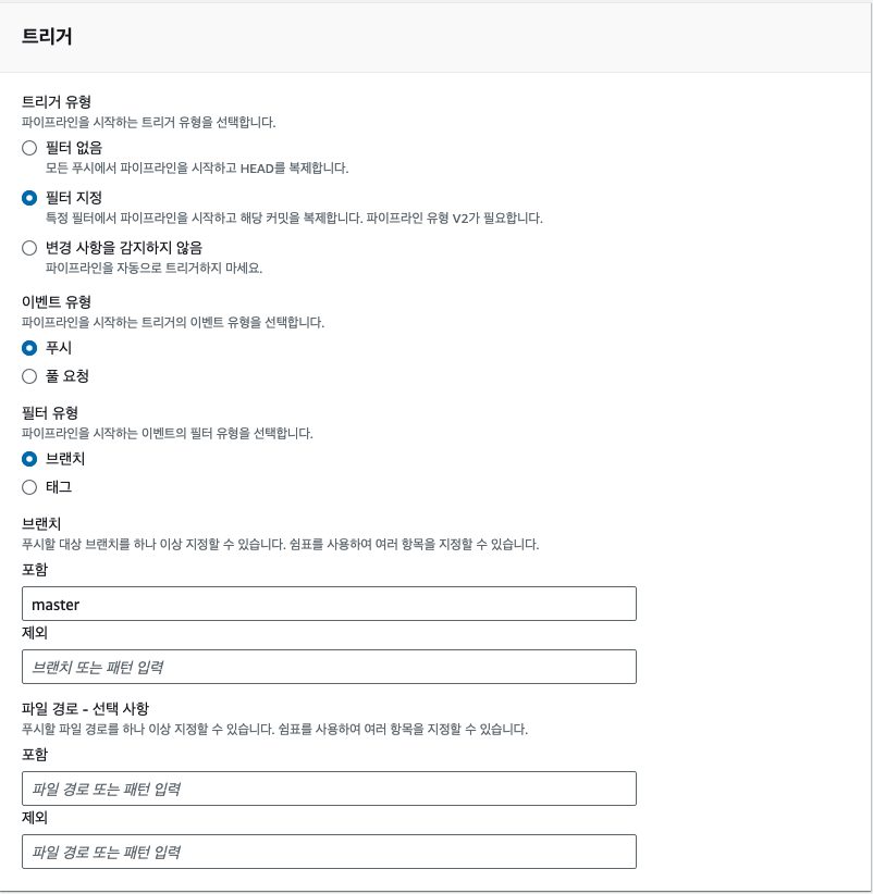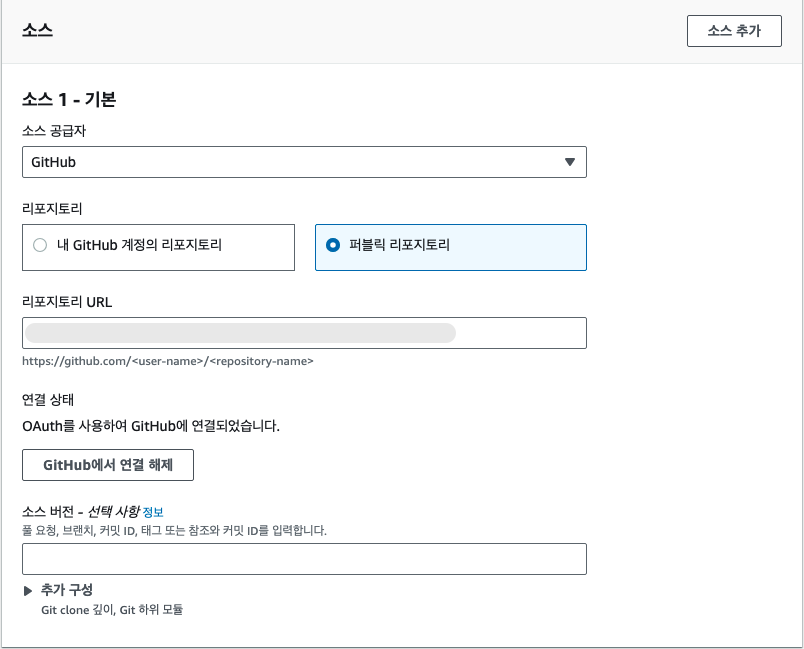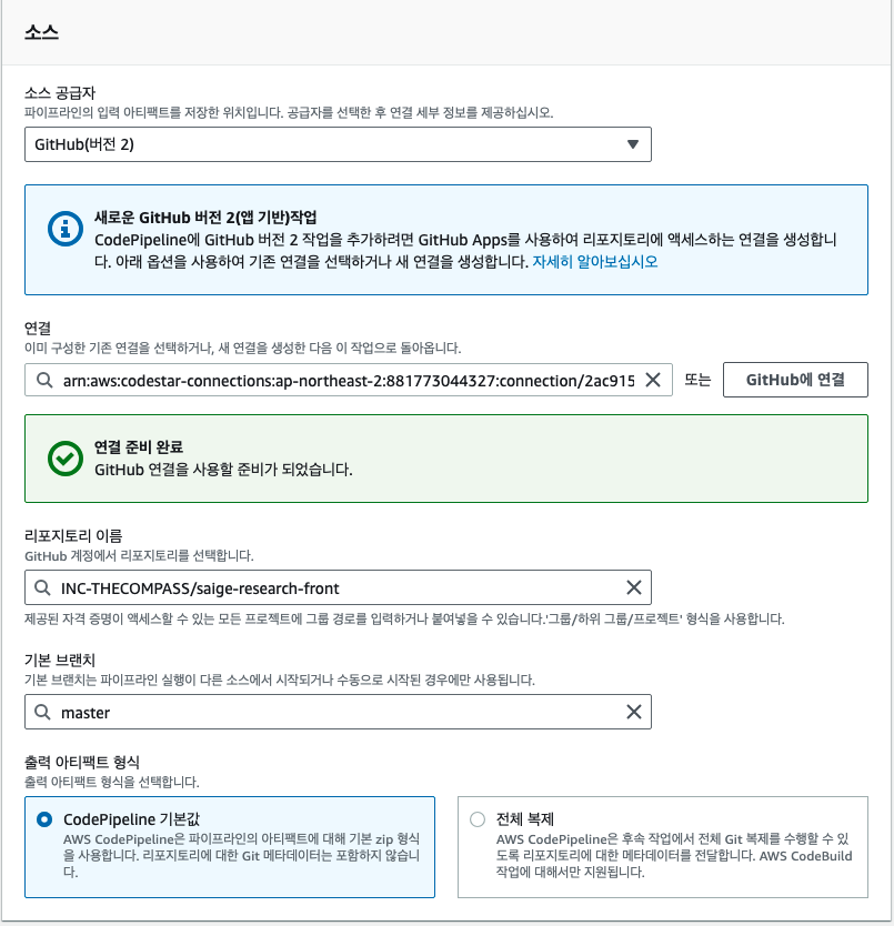 위에서 언급했듯이, 레포지토리의 master 변경사항을 기반으로 파이프라인을 실행시킬 것이다. 따라서 소스 공급자를 Github로 하고 해당 레포지토리를 연결해주면 된다.