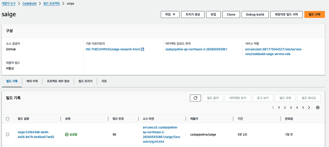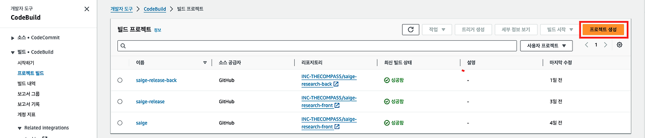 위 정보들을 입력하고 프로젝트 생성을 누르면 빌드 프로젝트가 생성된다.