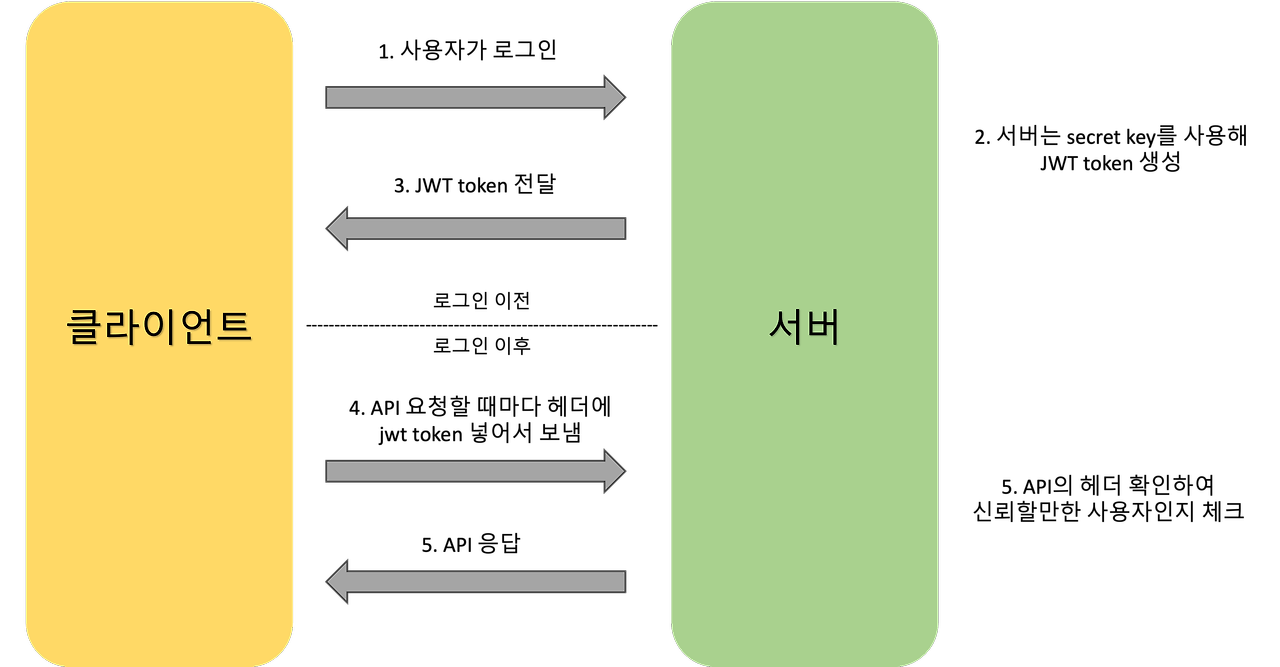 - 클라이언트는 이후에 API 요청을 보낼 때, 저장된 JWT Token을 HTTP 헤더에 포함시켜 서버에 전송한다.
