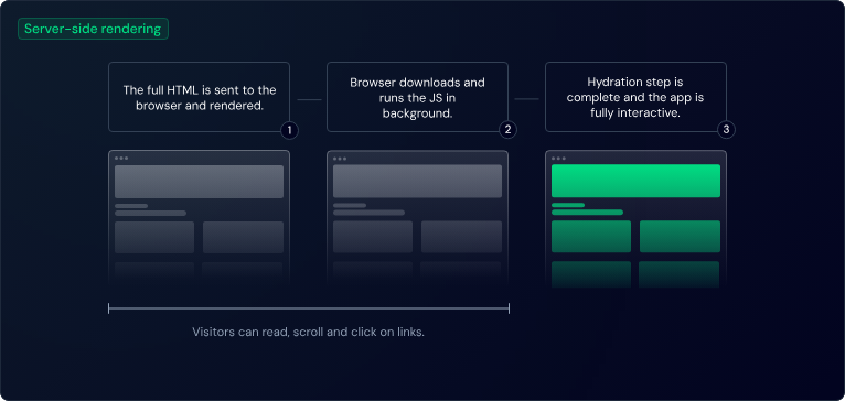 SSR의 경우, TTV는 빠를 수 있지만, TTI 사이에 공백이 발생할 수 있습니다. 이 간격이 길어질 경우, 사용자 경험(UX)에 부정적인 영향을 미칠 수 있습니다.
